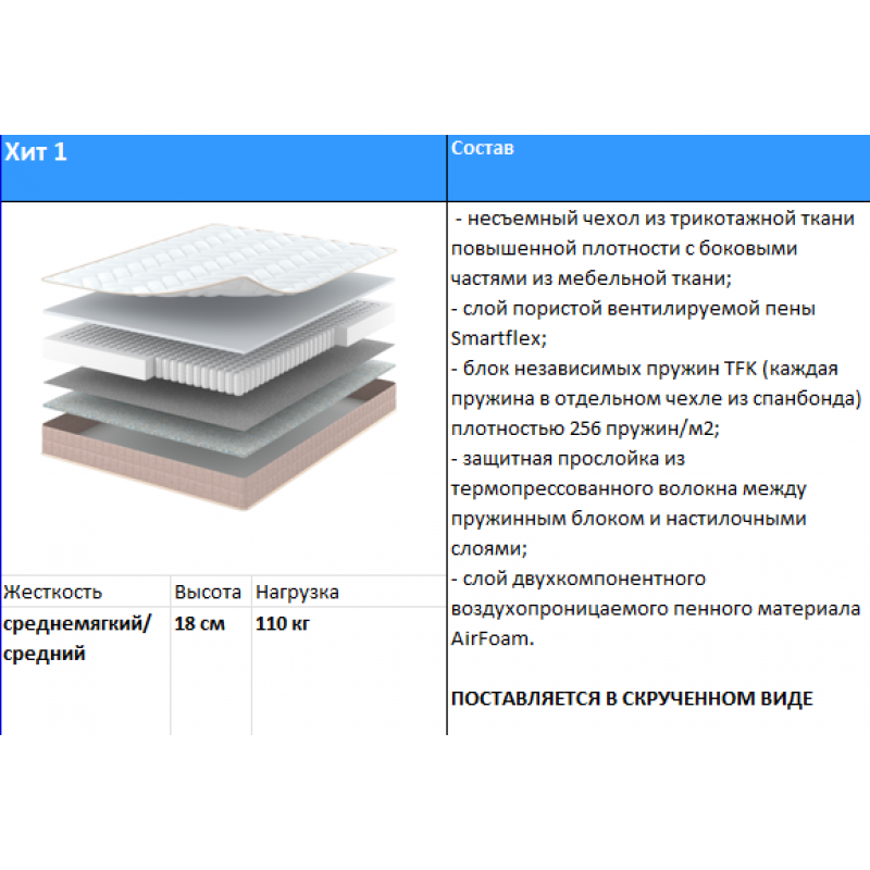 - блок независимых пружин TFK (каждая пружина в отдельном чехле из спанбонда) плотностью 256 пружин/м2;