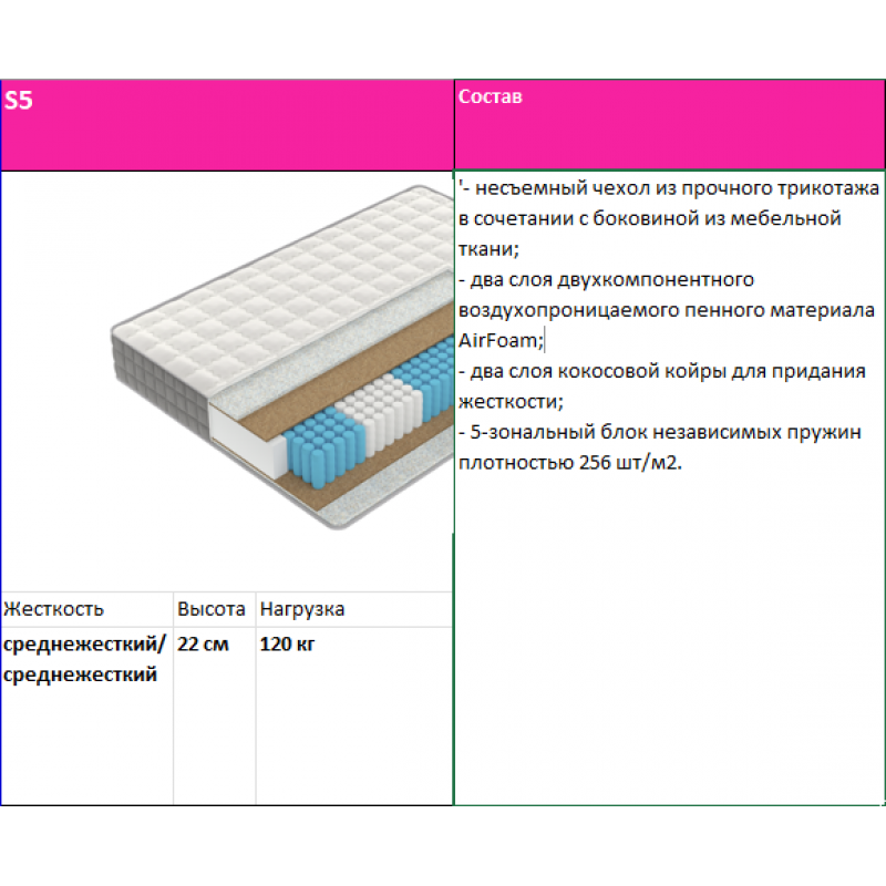 - 5-зональный блок независимых пружин плотностью 256 шт/м2.